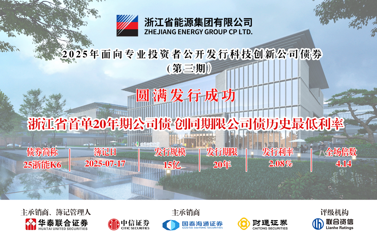本網訊 7月17日,浙能集團成功公開發行15億元規模的浙江省首單20年期科技創新公司債券,票面利率2.08%,創同期限公司債券歷史最低利率。