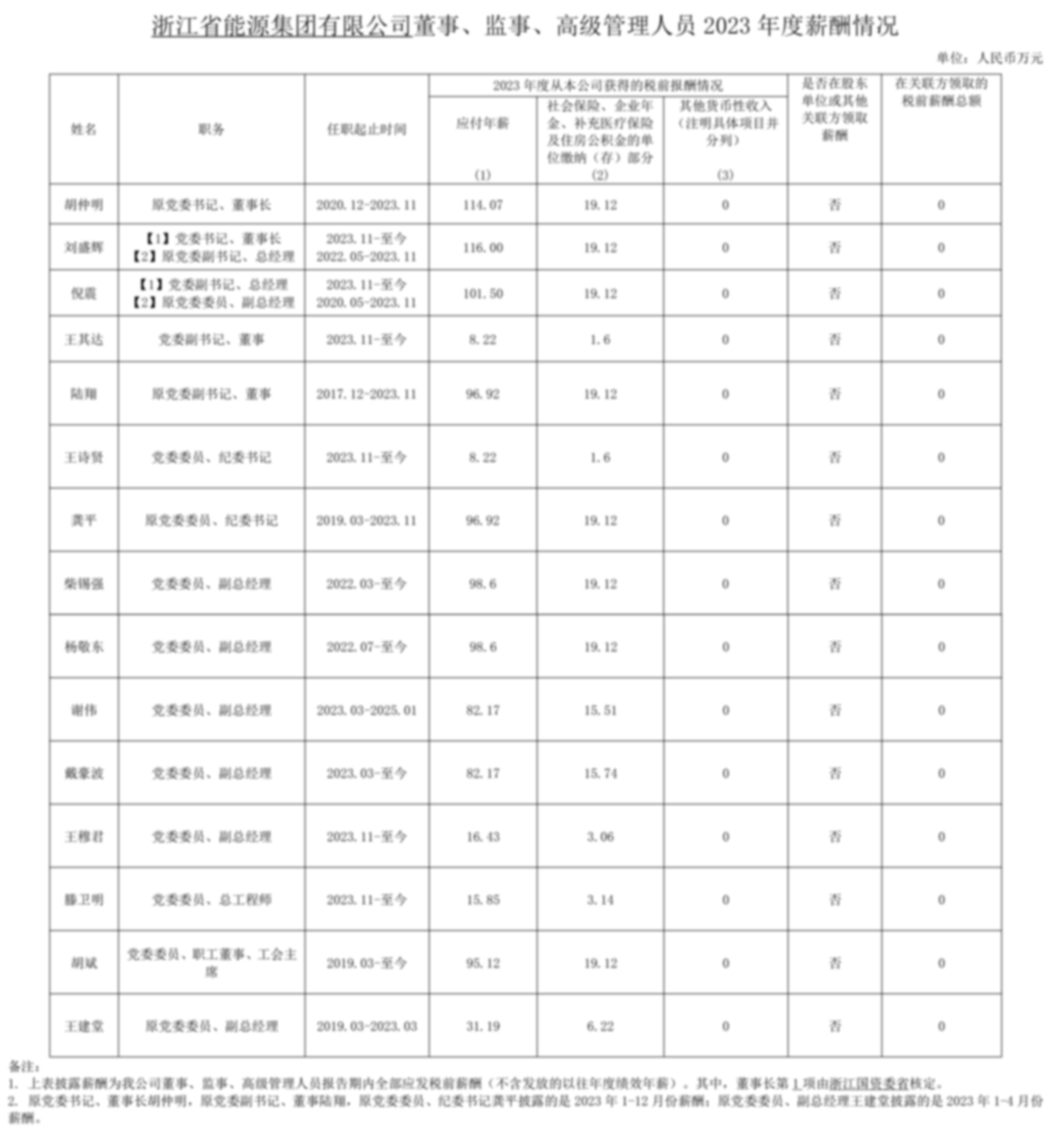 浙江省能源集團(tuán)有限公司董事、監(jiān)事、高級(jí)管理人員2023年度薪酬情況